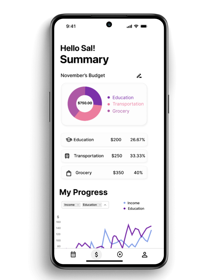 A budgeting application that allows students to track, budget and organize their expenses. Our application will take into consideration a student's personal goals, expenses, preferences, and earnings and use this data to help the student plan and proceed with their earnings, in a way which is most beneficial for them. The app will include different expense categories, and allow the student to allocate the desired amount they want to spend on each of these categories. The application will keep track of whether the student is within budget and help them reach their financial goals.