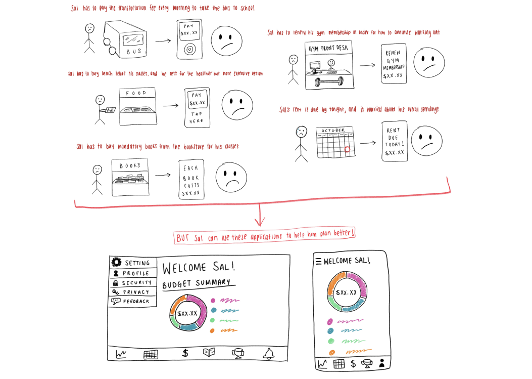 Looking at the personas Maddie, and Vladimir, it is understood that both of them are having a hard time organizing their expenses, understanding where their money is going, and learning how to maximize their savings and minimize their unnecessary spending. It especially becomes hard to keep track of their money because of the highly demanding and busy lifestyles they are both living. Vladimir has long days including a part time job, and Maddie is in a rigorous program commuting about an hour to school.