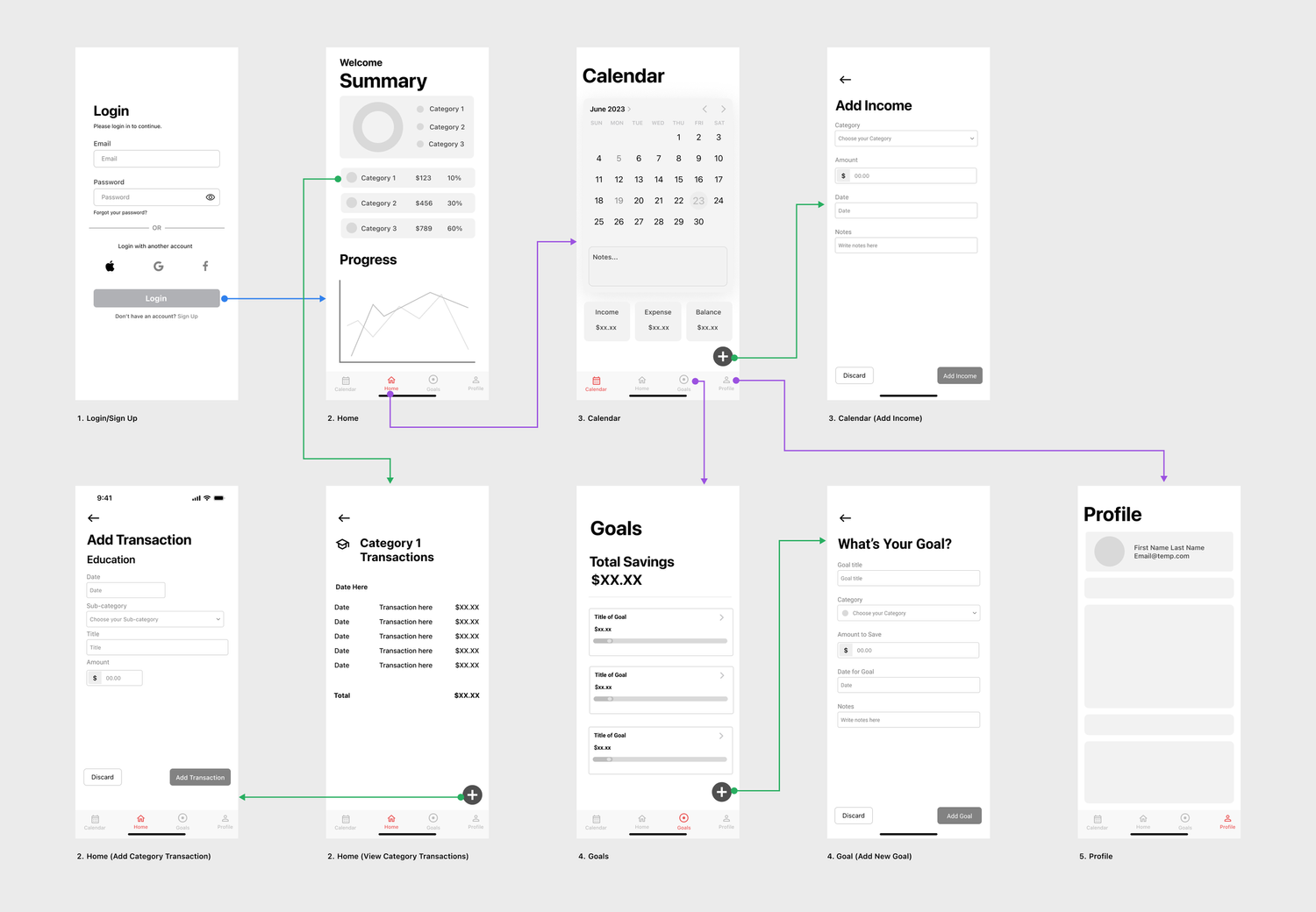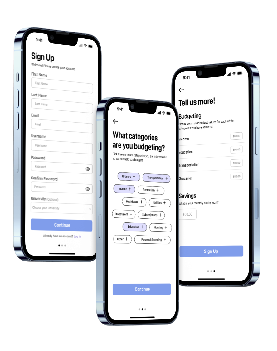 For new users who still need an account. The signing process consists of three main steps/pages. The first page requires the user to add their information, such as their name, email address, password, and an optional feature to add their university. The second page is catered towards creating a personalized homepage for them. Here, users must select three or more categories they would like to budget for. The third page depends on the second page, where users must put specific amounts regarding their budgeting values for each category and their savings. Once the user creates their account, they press the done button to indicate that their sign-up process has been completed.